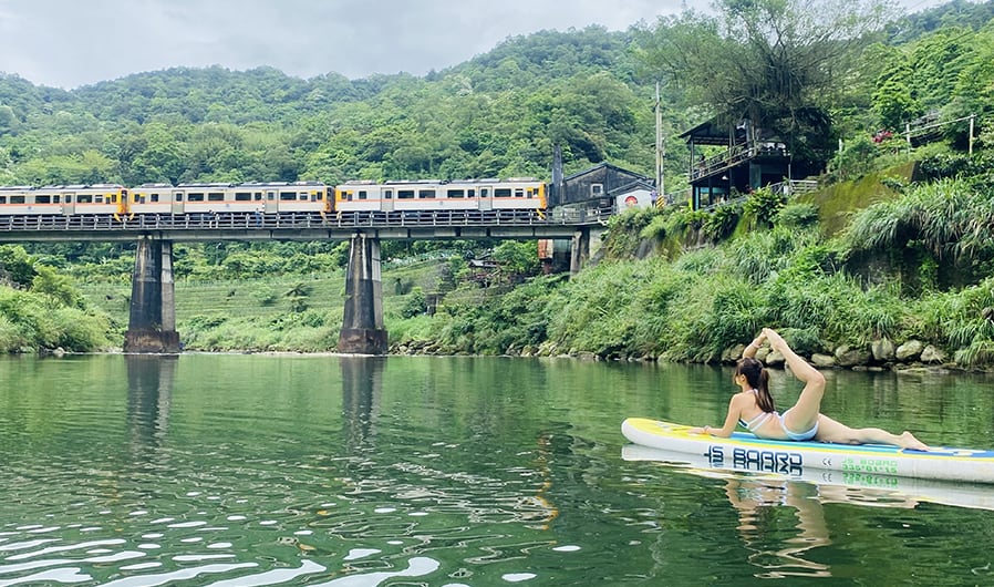 在《基隆河溪谷小仙境》中,輕鬆划著最夯的SUP經過火車鐵橋、幽靜河谷、可站可趴、可以很佛系躺在水面上放空、拍網美照、也可以競速比賽舒壓喔!
